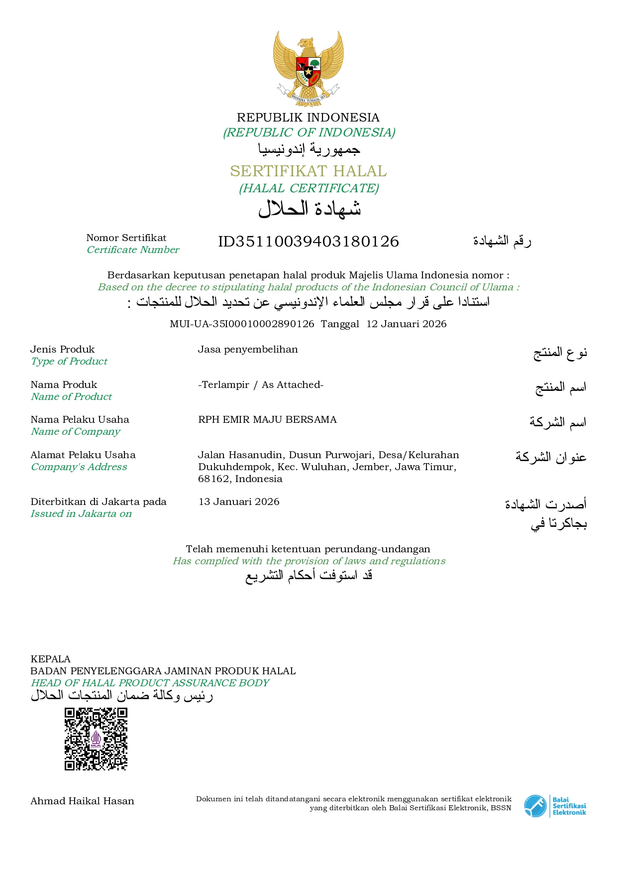 Alhamdululill RPH Emir Farm Telah mendapatkan sertifikasi halal untuk seluruh produk kami. Ini adalah bukti komitmen kami untuk menyediakan produk yang sesuai dengan prinsip-prinsip Islam.